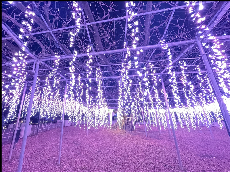 花のない時期だけど、イルミネーションで藤の花を表現。綺麗。