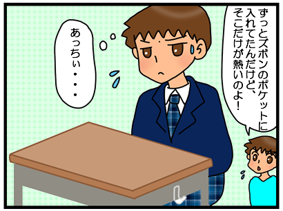 きーくんはズボンのポケットにカイロを入れてたそうなんですが、そこだけピンポイントで熱かったそうです。(イラストでは制服の上着を着てますけど、本当は体操服かジャージで過ごすことになっているので、ちょうど良いポケットがズボンにしかないのかと思われます。)