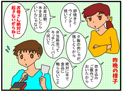 食中毒が怖いから、お弁当箱も調理器具もしっかり洗って、絶対に素手で食品を触らずに作って、冷蔵庫に保存しとけと・・・。