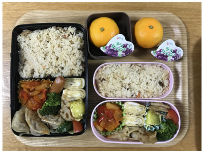 今日は とり五目ごはん、手作り餃子&エビチリ弁当です。