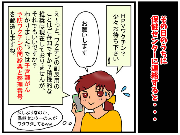 電話を取った方がHPVワクチンの手順がわからなかったようで、わかる人を探してバタバタしていました。たぶん、保健センターでも問い合わせが久しぶりだったようです。