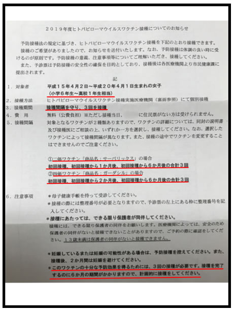 HPVワクチンの対象は小学校6年生~高校1年生で、ワクチンは全部で3回打ちますよ~というお知らせとか。